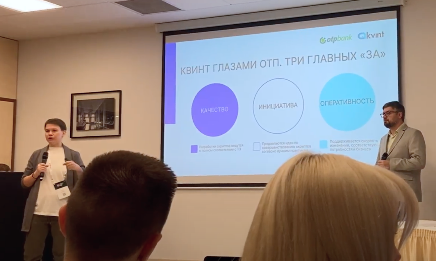 Одна из сессий была посвящена разработке голосового робота для партнеров из ОТП банка. В ходе этой сессии были рассмотрены несколько кейсов, включая продажу кредитов, NPS опросы и работу с удержанием клиентов. Представитель ОТП банка, поделилась особенностями технической реализации проекта, защитой конфиденциальных данных и результатами. Она также раскрыла, почему они решили масштабировать работу с роботами КВИНТ и увеличить контактную базу в 15 раз!