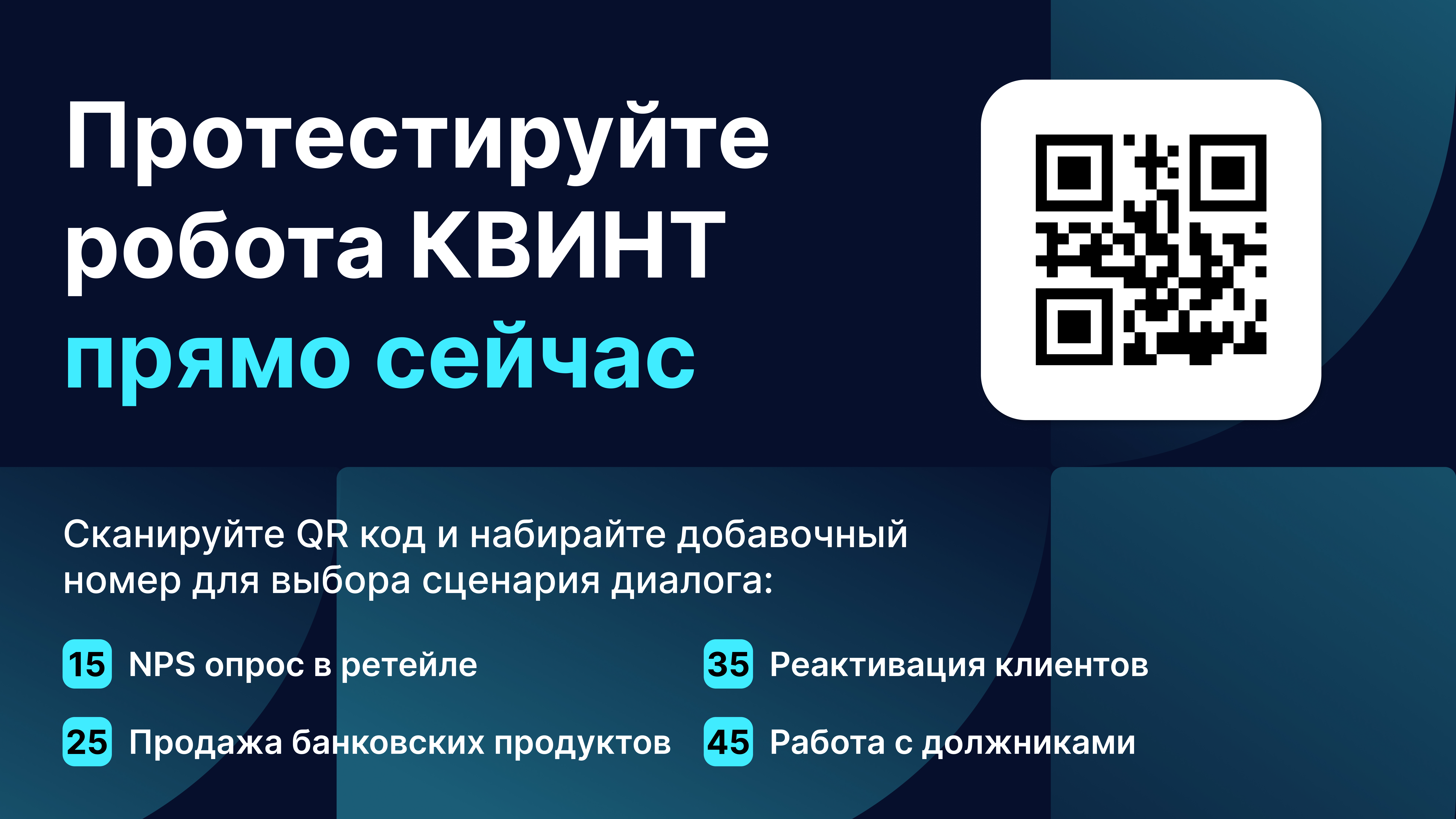 Кроме участия в экспертных сессиях, КВИНТ также представила своих роботов на выставке Customer Contacts Week. Участники мероприятия имели возможность пообщаться с роботами КВИНТ и оценить их эффективность в различных сценариях, включая NPS-опросы, продажу банковских продуктов, работу с должниками и реактивацию клиентов.